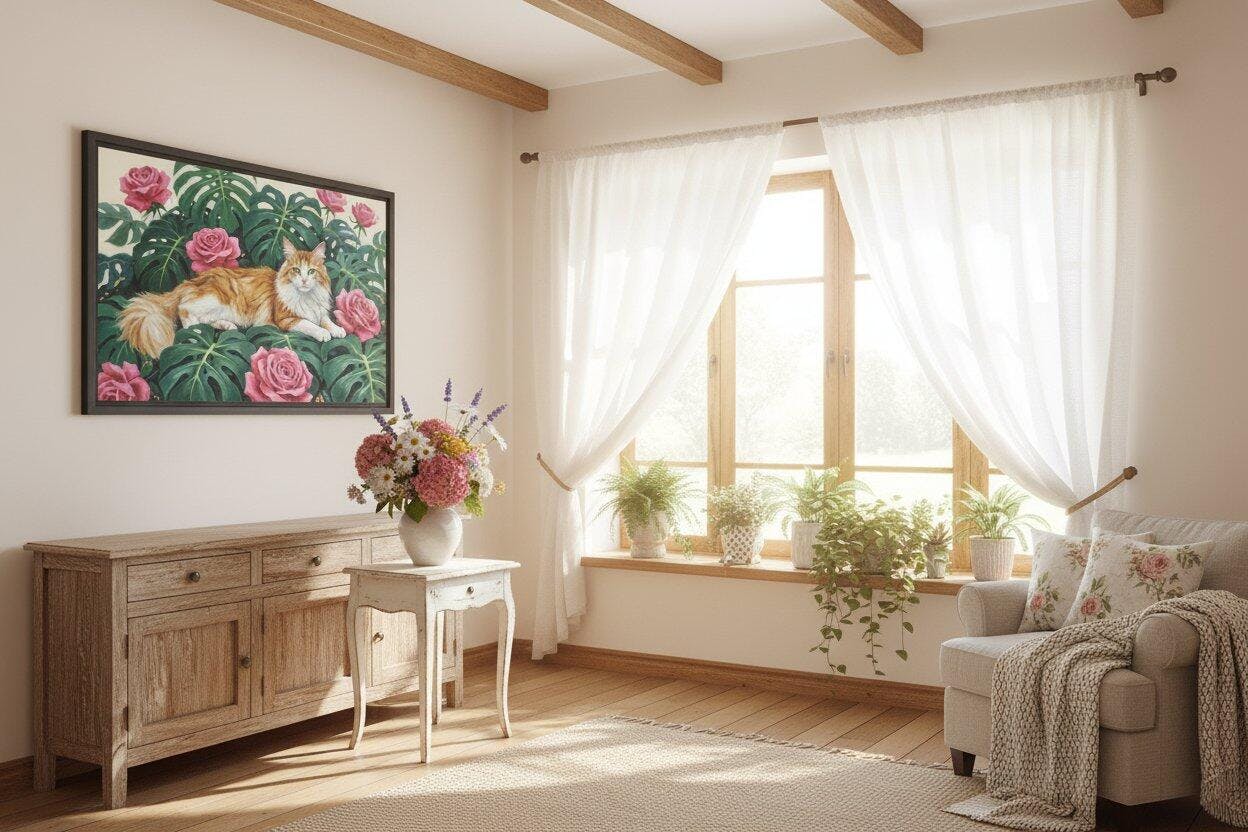 This is hands down my favorite piece of wall art. The detail on the flowers and the cat's expression is just perfect.