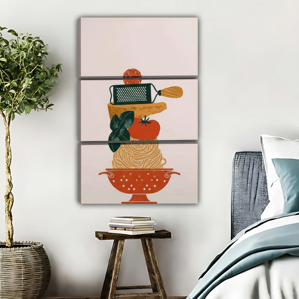 Adorable kitchen decor! The pasta, tomato, and basil stack is so creative. Quality print and it looks amazing on my kitchen wall. Very happy!