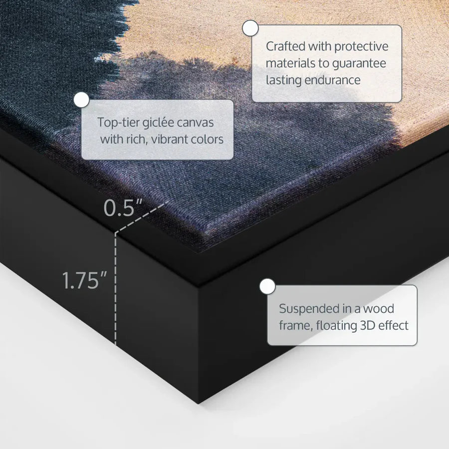 A: Framed art includes a decorative outer wooden frame and comes ready to hang. Canvas art is stretched over an internal wooden stretcher (no outer frame) — it is also ready to hang, and you can later add a decorative frame if you’d like.